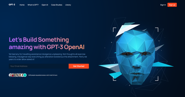 This is a mock landing page promoting a new AI program. The web page includes a place for users to sign up for the program, features of the AI, and notable companies that vouch for the credibility of the program.
